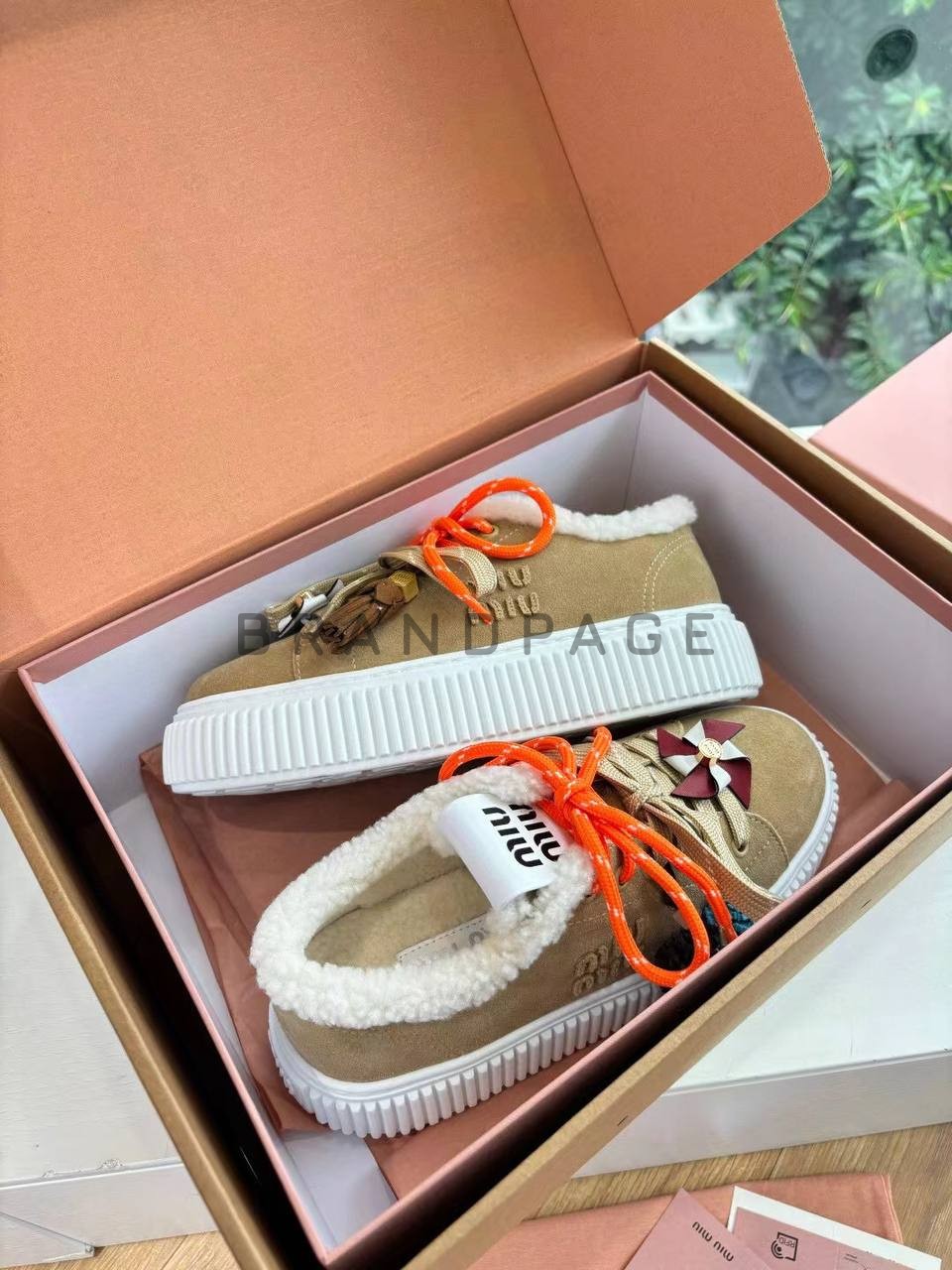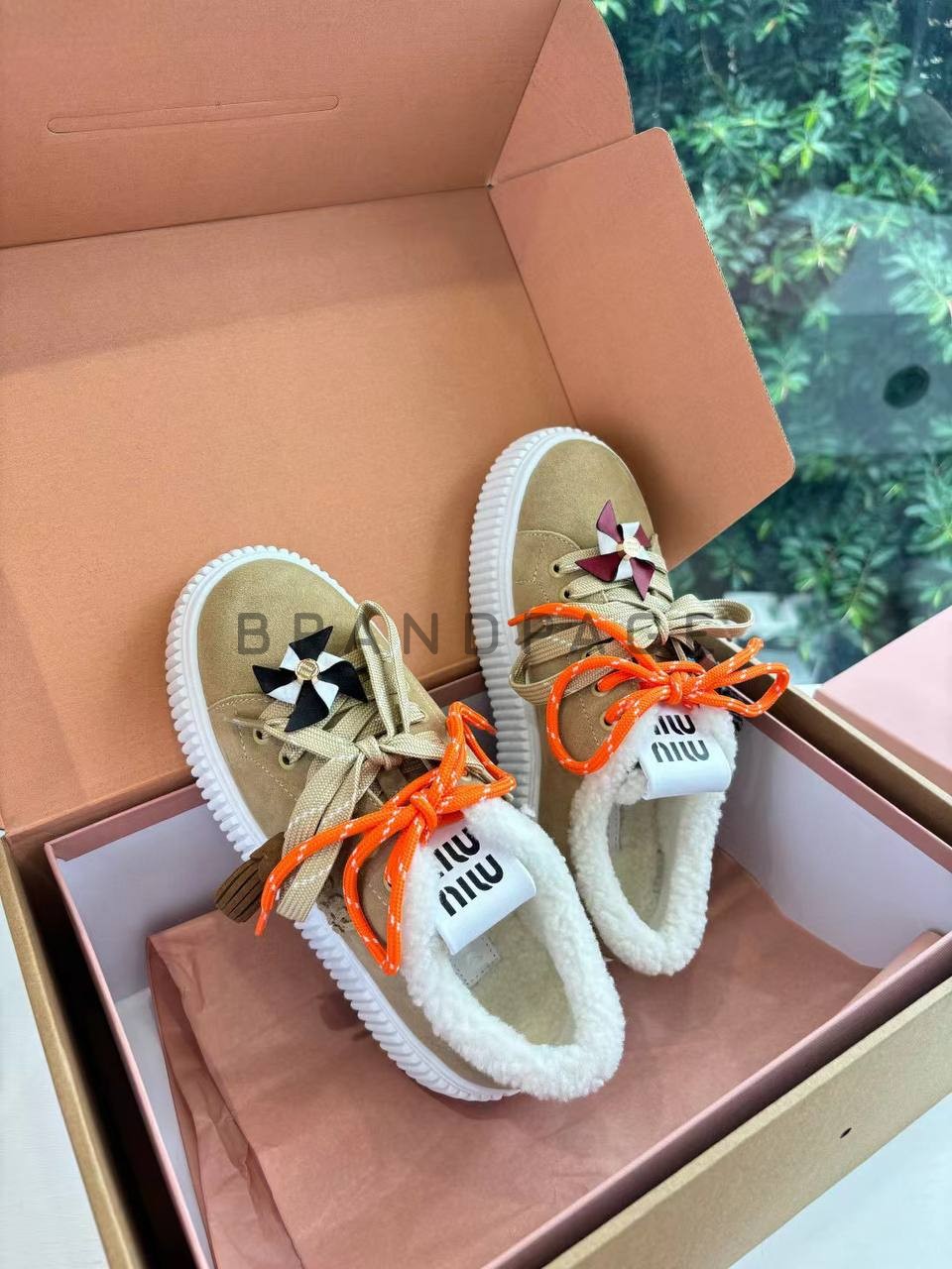 Элегантные кеды от Miu Miu, украшенные мягким искусственным мехом, выглядят роскошно и придают образу необычайную теплоту. В изделии гармонично сочетаются классические оттенки коричневого и белого, которые легко впишутся в городской гардероб. Эти кроссовки подчеркивают женственность и свободу стиля, позволяя чувствовать себя уверенно при любых обстоятельствах.