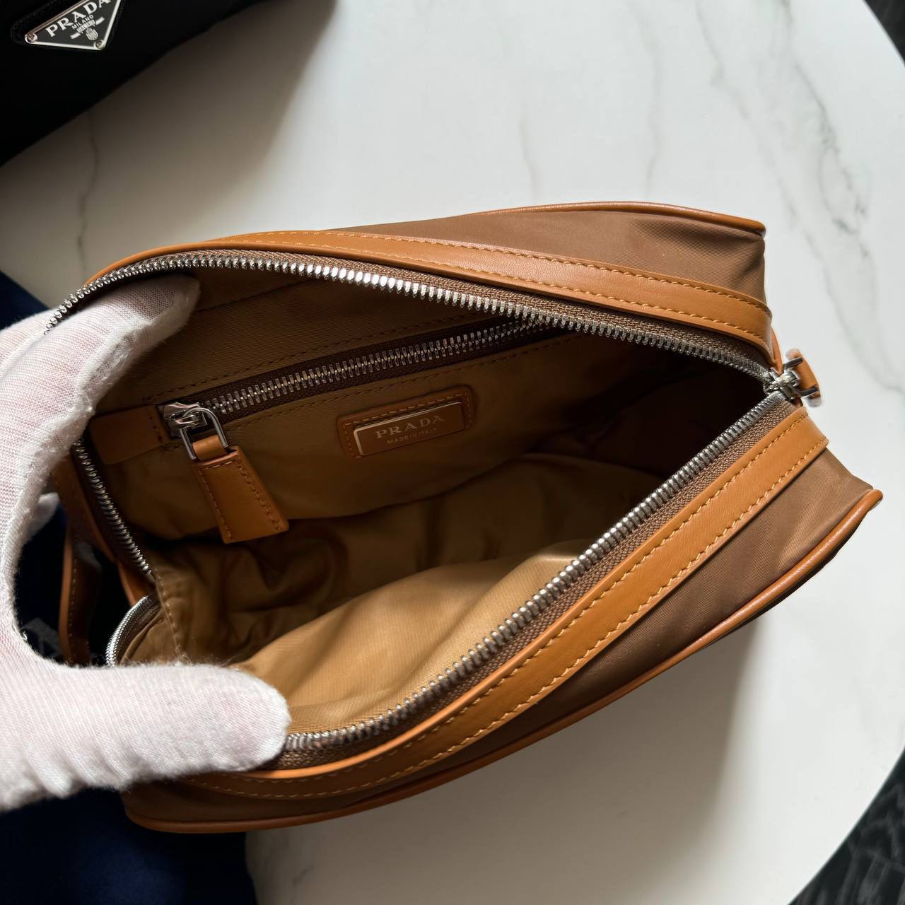 С несессером от Prada вы сможете легко организовать свои вещи и всегда иметь под рукой все необходимое. Его компактные размеры позволяют удобно помещать его в любую сумку, а стильный внешний вид делает его настоящим акцентом в вашем образе. Этот аксессуар идеально подходит для деловых поездок, путешествий или просто для повседневного использования. Не упустите возможность добавить в свою коллекцию этот уникальный элемент, который станет верным спутником в мире моды и стиля.