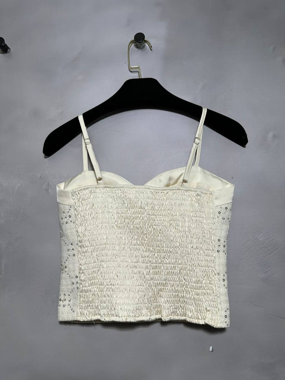 Каждый элемент дизайна этого топа продуман до мелочей. Стильный крой и уникальные детали делают его универсальным предметом, который можно носить как на вечерние мероприятия, так и на повседневные выходы. Топ легко комбинируется с различными предметами гардероба, позволяя создавать как классические, так и смелые образы. В нем вы будете чувствовать себя уверенно и привлекательно, что является важным аспектом в мире моды.
